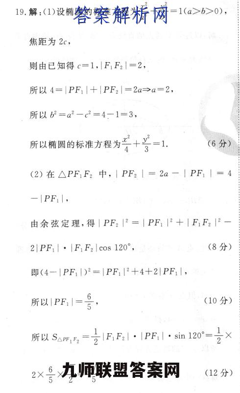 1,解:1)设椭圆的标准方程为后+芳=1(a>6>0),焦距为2c,则由已知得c=1,|F,F2|=2,所以4=|PF1|+|PF2|=2a→a=2,所以b2=a2-c2=4.-1=3,所以椭圆的标准方程为号+苦-1.(6分)(2)在△PFF2中,PF2|=2a-|PF1|=4-PF,由余弦定理,得|PF2|2=|PF,|2+|F1F2|2-2|PF|·F1F2|cos120°,(8分)即(4-|PF1|)2=|PF1I2+4+2PF|,所以PE=6,5(10分)所以Sa所,=号F,Fa·PF,·sin120=合×(12分)251