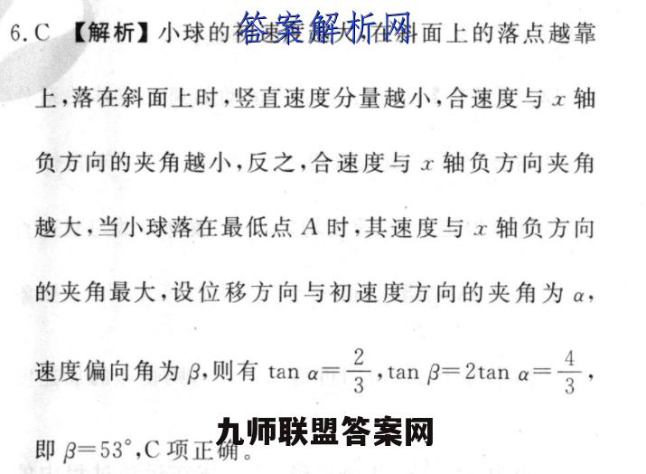 6.C【解析】小球的初速度越大,在斜面上的落点越靠上,落在斜面上时,竖直速度分量越小,合速度与x轴负方向的夹角越小,反之,合速度与x轴负方向夹角越大,当小球落在最低点A时,其速度与x轴负方向的夹角最大,设位移方向与初速度方向的夹角为α,速度偏向角为B,则有1ane=号,an月=21ana=43即3=53°,C项正确。
