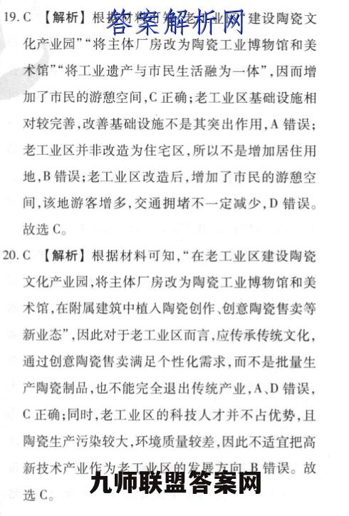 19.C【解析】根据材料可知,老工业区“建设陶瓷文化产业园”“将主体厂房改为陶瓷工业博物馆和美术馆”“将工业遗产与市民生活融为一体”,因而增加了市民的游憩空间,C正确:老工业区基础设施相对较完善,改善基础设施不是其突出作用,A错误:老工业区并非改造为住宅区,所以不是增加居住用地,B错误:老工业区改造后,增加了市民的游憩空间,该地游客增多,交通拥堵不一定减少,D错误。故选C。20.C【解析】根据材料可知,“在老工业区建设陶瓷文化产业园,将主体厂房改为陶瓷工业博物馆和美术馆,在附属建筑中植入陶瓷创作、创意陶瓷售卖等新业态”,因此对于老工业区而言,应传承传统文化,通过创意陶瓷售卖满足个性化需求,而不是批量生产陶瓷制品,也不能完全退出传统产业,A、D错误,C正确:同时,老工业区的科技人才并不占优势,且陶瓷生产污染较大,环境质量较差,因此不适宜把高新技术产业作为老工业区的发展方向,B错误。故选C。
