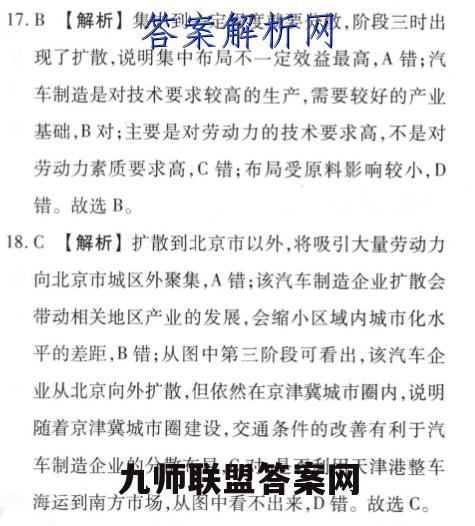 17.B【解析】集中到一定程度就要分散,阶段三时出现了扩散,说明集中布局不一定效益最高,A错;汽车制造是对技术要求较高的生产,需要较好的产业基础,B对;主要是对劳动力的技术要求高,不是对劳动力素质要求高,C错;布局受原料影响较小,D错。故选B。18.C【解析】扩散到北京市以外,将吸引大量劳动力向北京市城区外聚集,A错:该汽车制造企业扩散会带动相关地区产业的发展,会缩小区域内城市化水平的差距,B错;从图中第三阶段可看出,该汽车企业从北京向外扩散,但依然在京津冀城市圈内,说明随着京津冀城市圈建设,交通条件的改善有利于汽车制造企业的分散布局,C对:是否利用天津港整车海运到南方市场,从图中看不出来,D错。故选C。