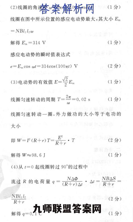 17.【解析】(1)根据右手定则可知线圈中感应电流方向为adcba(2分)(2)线圈的角速度w=2πn=100πrad/s(1分)线圈在图中所示位置的感应电动势最大,其大小Em=NBl l2解得Em=314V(1分)感应电动势的瞬时值表达式e=Em cos wt=314cos(100mt)V(2分)(3)电动势的有效值E=号E.(1分)线圈匀速转动的周期T=2π=0.02s(1分)线圈匀速转动一圈,外力做功的大小等于电功的大小即w=P(R+)T=R千,·T(2分)解得W≈98.6J(1分)(4)从t=0起线圈转过90°的过程中N△Φ流过R的电荷量g=(R+r)△·1=NBASR+rNBl laR+r(2分)解得q=0.1C(1分)