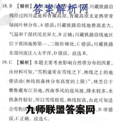 18.B【解析】读图并结合所学知识可知,川藏铁路沿线经过四川盆地和青藏高原,青藏高原无亚热带常绿阔叶林分布,A错误:川藏铁路沿线地势高差大,气温和干湿状况差异大,B正确:川藏铁路沿线地区位于我国地势第一、二级阶梯处,C错误:川藏铁路东部河流注入太平洋,D错误。故选B。19.C【解析】本题主要考查影响自然带分布的因素。由材料可知,“雪豹通常在雪线之下、林线之上的地带活动(林线指森林分布高度的上限)”,林芝位于雅鲁藏布江谷地,西南季风的迎风坡,降水较多,水热条件较好,所以雪线较低,林线较高,由此可知适合雪豹活动的范围相对背风坡较小,A、B、D项错误,C正确。故选C。