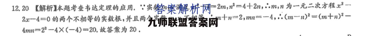 12.20【解析】本题考查韦达定理的应用.,实数n,n满足m2一4=2m,n2=4十21,∴m,n为一元二次方程x2一2x一4=0的两个不相等的实数根,并且两个实数m,n不相等,∴m十n=2,mn=一4,∴.(m一n)2=(m十n)2一4mn=22-4X(-4)=20.故答紫为20,