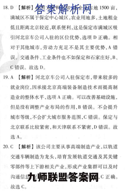 18.D【解析】由图文材料可知,此企业占地1500亩,满城区不属于保定中心城区,农业用地多,土地租金低且距离北京较近,联系便利,这是保定市满城区吸引河北京车公司入驻的区位优势,选项D正确。相对于其他城市,劳动力充足不是其主要优势,A错误。交通条件、工业条件也不如保定和石家庄好,B、C错误。故选D。19.A【解析】河北京车公司入驻保定市,带来较多的就业岗位,因承接北京高端装备制造技术而提高制造业的整体水平,选项A正确。可以改善基础设施,但是没有调整产业布局的作用,B错误。不会提升城市等级,不会扩大城市服务范围,C错误。保定与北京联系比较紧密,和天津联系不紧密,D错误。故选A。20.C【解析】该公司主要从事高端制造产业,以轨道交通车辆制造为龙头,培育发展轨道交通及其关键零部件等上下游相关产业,形成产业集群可以及时沟通信息,促进技术创新,提升产品质量,C正确。故选C。