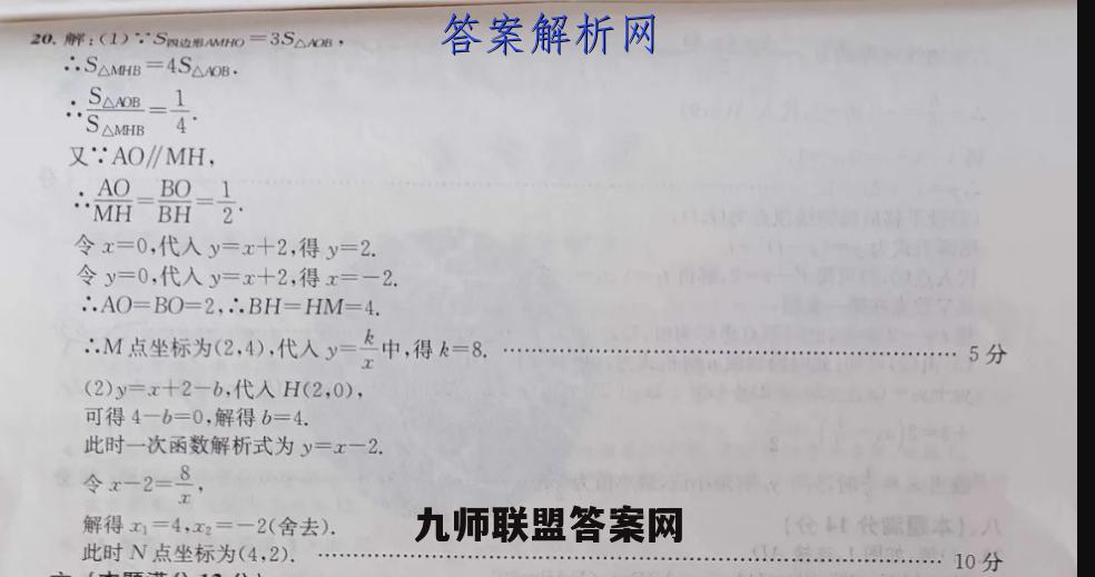 20.解:(1),S网边形wH0=3S△B,∴.S△HB=4S△OB.:S△OB=·SMHB4又,AO∥MH,.A0BO 1…M丽BH2令x=0,代人y=x+2,得y=2.令y=0,代入y=x+2,得x=-2.∴.AO=BO=2,∴.BH=HM=4.M点坐标为(2,4),代入y=中,得k=8,5分(2)y=x+2-b,代入H(2,0),可得4一b=0,解得b=4.此时一次函数解析式为y=x一2.令x-2=8解得1=4,x2=一2(舍去).(位代厘本)此时V点坐标为(4,2).………10分