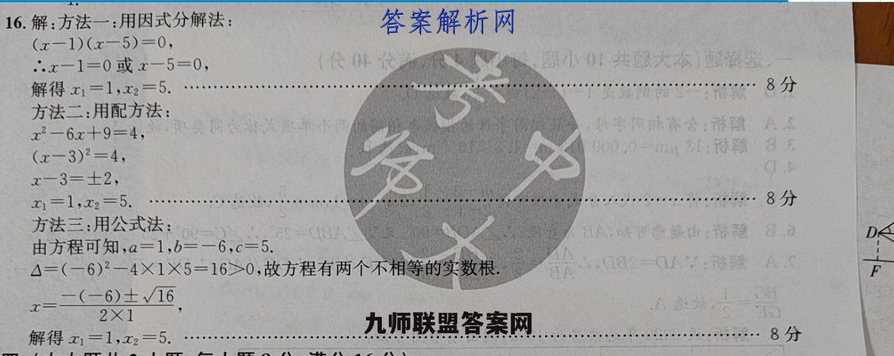 16.解:方法一:用因式分解法:(x-1)(x-5)=0,∴.x-1=0或x-5=0,小1共大本)解得x1=1,x2=5.8分方法二:用配方法:x2-6x+9=4,伞阿会:停碱AS(x-3)2=4,000,04:谢8x-3=士2,x1=1,x2=5.……8分方法三:用公式法:,陕源部由:存酸8D∈由方程可知,a=1,b=-6,c=5△=(一6)2一4×1×5=16>0,故方程有两个不相等的实数根x=-(-6)±162×1人,解得x1=1,x2=5.………8分