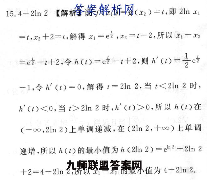 15.4-2ln2【解析】设f(x1)=g(x2)=t,即2lnx1=t,x2十2=t,解得x1=ez,x2=t-2,所以x1-x2=ei-+2,令h()=e-t+2,则W()=号ei-1,令h'(t)=0,解得t=2ln2,当t<2n2时,h'(t)<0,当t>2ln2时,h'(t)>0,所以h(t)在(-∞,2ln2)上单调递减,在(2ln2,+∞)上单调递增,所以h(t)的最小值为h(2ln2)=eh2-2ln2+2=4-2ln2,所以x1一x2的最小值为4一21n2.