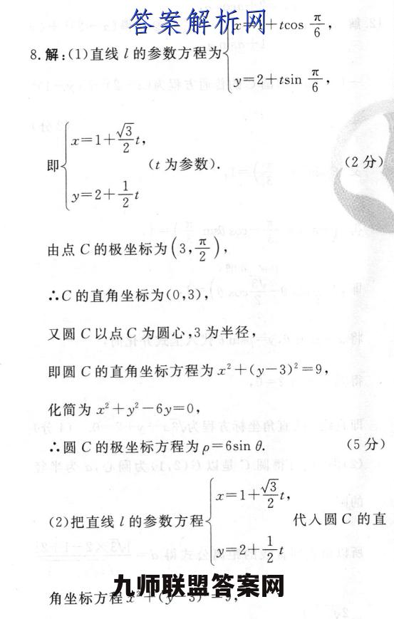 z=1+cos,88.解:(1)直线1的参数方程为y=2+tsin否,=1+即(t为参数).(2分)y=2+由点C的极坐标为(3,受),∴.C的直角坐标为(0,3),又圆C以点C为圆心,3为半径,即圆C的直角坐标方程为x2+(y一3)2=9,化简为x2+y2一6y=0,∴.圆C的极坐标方程为p=6sin0.(5分)=1+9(2)把直线L的参数方程代人圆C的直y=2+2角坐标方程x2十(y一3)2=9,整理得t2+(w3-1)t-7=0,设点A,B对应的参数分别为t1,t2,.t1·t2=-7,.|PA·IPB|=|6|·|t2|=7.(10分)