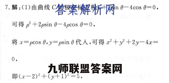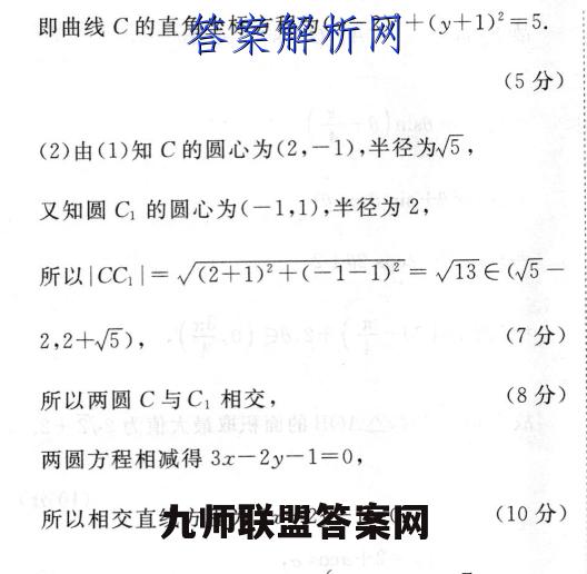 7.解:(1)由曲线C的极坐标方程p十2sin0-4cos0=0,可得p2+2osin0-4ocos0=0,将x=cos0,y=psin9代入,可得x2+y2+2y-4x=0,即(x-2)2+(y+1)2=5,即曲线C的直角坐标方程为(x一2)2+(y+1)2=5.(5分)(2)由(1)知C的圆心为(2,一1),半径为√5,又知圆C1的圆心为(一1,1),半径为2,所以|CC,|=√(2+1)2+(-1-1)z=√13∈(5-2,2+√5),.8(7分)所以两圆C与C1相交,(8分)两圆方程相减得3x一2y一1=0,所以相交直线方程为3x一2y一1=0.(10分)