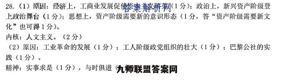 28.(1)原因:经济上,工商业发展促使资本主义萌芽(1分):政治上,新兴资产阶级登上政治舞台(1分):思想上,资产阶级需要新的意识形态(1分,答“资产阶级需要新文化”也可得1分)。内核:人文主义。(2分)(2)原因:工业革命的发展(1分):工人阶级政党组织的壮大(1分):巴黎公社的实践(1分)。精神:实事求是(1分),与时俱进(1分)