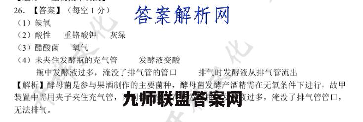 26.【答案】(每空1分)(1)缺氧(2)酸性重铬酸钾灰绿(3)醋酸菌氧气(4)未夹住发酵瓶的充气管发酵液变酸瓶中发酵液过多,淹没了排气管的管口排气时发酵液从排气管流出【解析】酵母菌是参与果酒制作的主要菌种,酵母菌发酵产酒精需在无氧条件下进行,故甲装置中需用夹子夹住充气管,丙同学的错误在于发酵瓶中发酵液过多,淹没了排气管管口,无法排气。