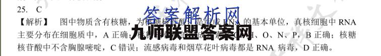 25.C【解析】图中物质含有核糖,为核糖核苷酸,是组成RNA的基本单位,真核细胞中RNA主要分布在细胞质中,A正确:核糖核苷酸的组成元素是C、H、O、N、P,B正确:核糖核苷酸中不含胸腺嘧啶,C错误:流感病毒和烟草花叶病毒都是RNA病毒,D正确。