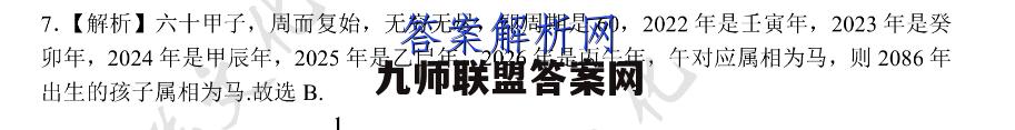 7.【解析】六十甲子,周而复始,无穷无尽,即周期是60,2022年是壬寅年,2023年是癸卯年,2024年是甲辰年,2025年是乙已年,2026年是丙午年,午对应属相为马,则2086年出生的孩子属相为马.故选B.