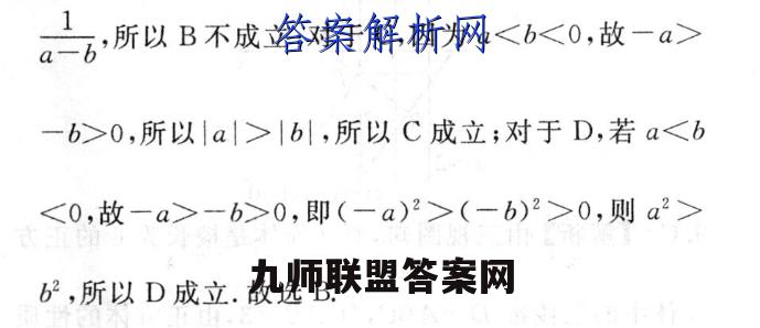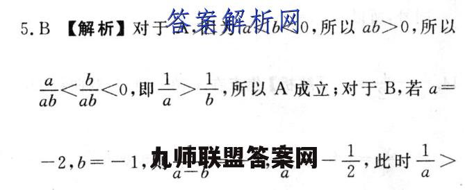 5.B【解析】对于A,因为a 0,所以品 名,所以A成立:对于B,若4=-2,6=-1,则。6=-1,合=-合,此时日>a二b所以B不成立;对于C,因为a 一b>0,所以|al>|b|,所以C成立;对于D,若a -b>0,即(-a)2>(-b)2>0,则a2>b2,所以D成立.故选B.