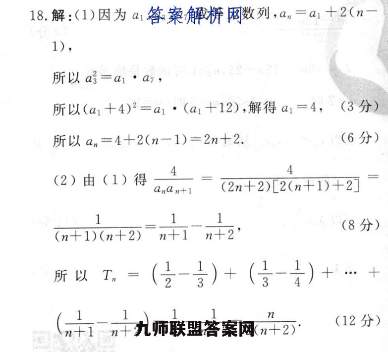 18.解:(1)因为a1,a3,a7成等比数列,an=a1十2(n一1),所以a=a1·a7,所以(a1+4)2=a1·(a1+12),解得a1=4,(3分)所以am=4十2(n-1)=2n十2.(6分)44(2)由(1)得anQn+1(2n+2)[2(n+1)+2]111(8分)(n+1)(n+2)n十1n+2'所以工.=(分-号)+(号-)+…十n2(n+2)1(12分)