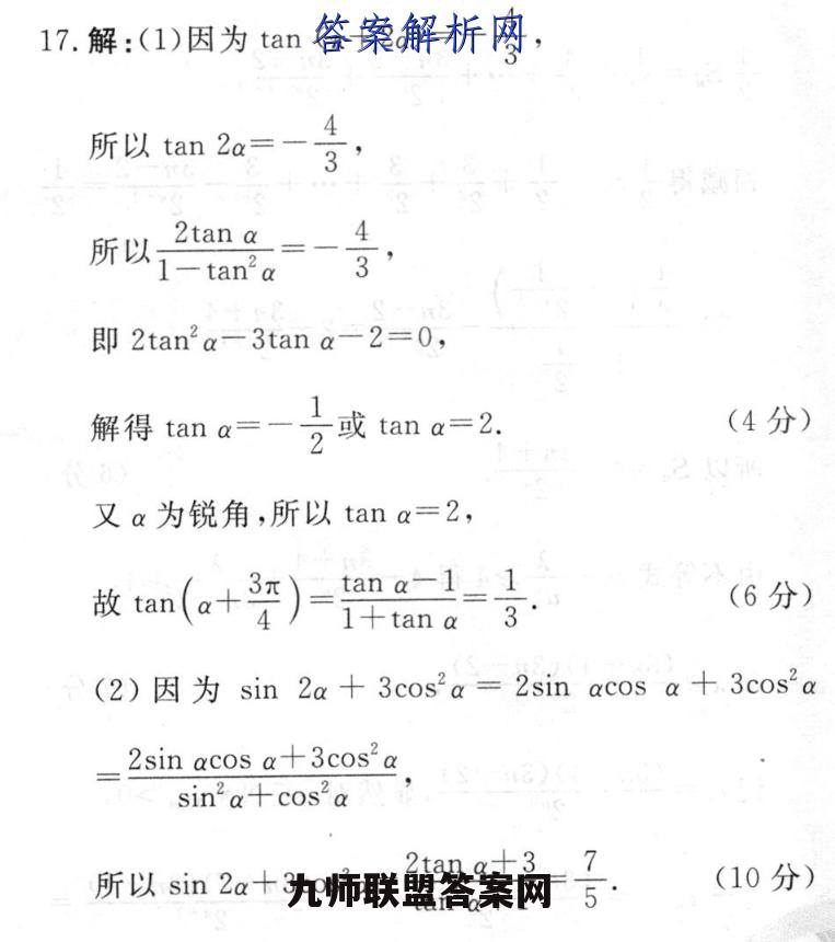 17,解:(1)因为tan(x十2a)=-专,4所以tan2a=-431所以2tan a41-tan"a即2tan2a-3tana-2=0,解得ana=一号或ana=2。(4分)又a为锐角,所以tana=2,故an(。+)钾n号(6分)3(2)因为sin2a+3cos2a=2 sin acos a+3cos2a2sin acos a+3cos'a)sin2a+cos2a所以sin2a+3cos2a=2tan a+3(10分)tan2a+1