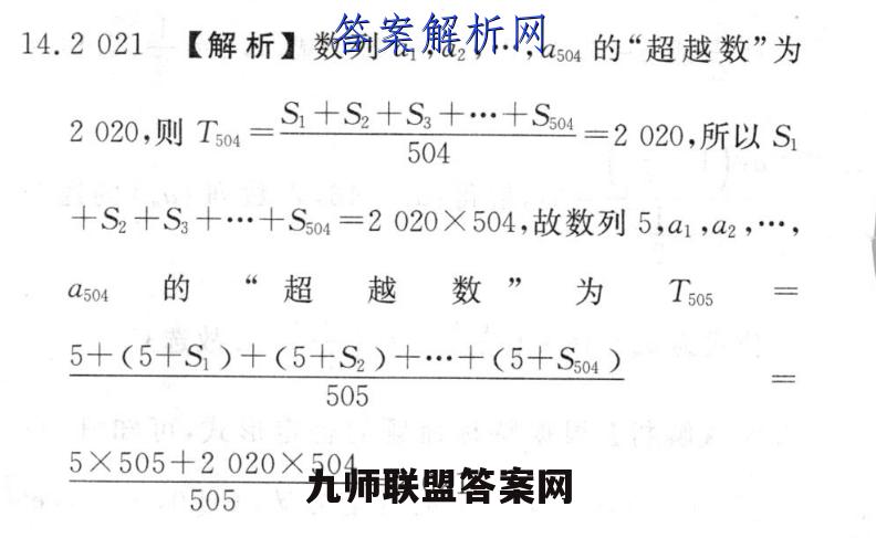 14.2021【解析】数列a1,a2,…,aso4的“超越数”为2020.则Tm-S+S+S++S=2020.所以S.504十S2十S3十…十S504=2020X504,故数列5,a1a2,…,a504的“超越数”为T5055+(5+S1)+(5+S2)+…+(5+S5o4)三5055×505+2020×504505=2021.