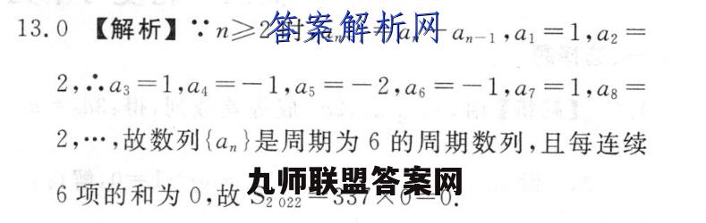 13.0【解析】.n≥2时,am+1=am一am-1,a1=1,a2=2,∴.a3=1,a4=-1,a5=-2,a6=-1,a7=1,a8=2,…,故数列{αn}是周期为6的周期数列,且每连续6项的和为0,故S2022=337×0=0.