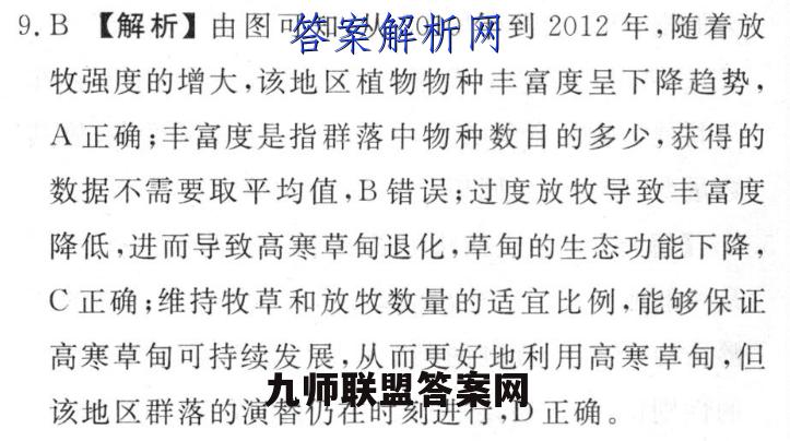 9.B【解析】由图可知,从2010年到2012年,随着放牧强度的增大,该地区植物物种丰富度呈下降趋势,A正确;丰富度是指群落中物种数目的多少,获得的数据不需要取平均值,B错误;过度放牧导致丰富度降低,进而导致高寒草甸退化,草甸的生态功能下降,C正确;维持牧草和放牧数量的适宜比例,能够保证高寒草甸可持续发展,从而更好地利用高寒草甸,但该地区群落的演替仍在时刻进行,D正确。