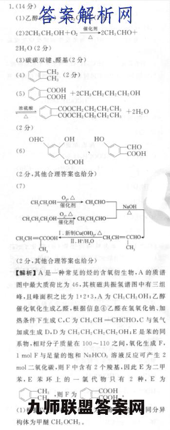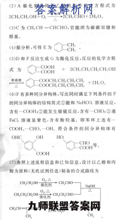 1.(14分)(1)乙醇(1分)CH,OCH(1分)(2)2CH,CH:OH+O:-强化都,2CH,CHO+△2H0(2分)(3)碳碳双键、醛基(2分)(4)CH,CH(2分)(5)COOHCOOH+2CH,CH2 CH,CH:OH浓硫酸-COOCH.CH.CHCH +2H.O△COOCH:CH CH CH(2分)OHCOHHOCHO(6COOHCOOH(2分,其他合理答案也给分)(7)0△CH,CHOH-衢化剂→CH,CHONaOHCH,CH,CH,OH0,△△催化剂CH,CH,CHOCH,CH=CCOOH.新制Co,△cH,CH=CCHOII.H/HOCH,CH,(2分,其他合理答案也给分)【解析】A是一种常见的烃的含氧衍生物,A的质谱图中最大质荷比为46,其核磁共振氢谱图中有三组峰,且峰面积之比为1:2:3,A为CH,CH:OH:乙醇催化氧化生成乙醛,根据信息④乙醛在氢氧化钠、加热条件下生成C,C为CH CH-CHCHO,C与氢气加成生成D,D为CHCH2CH,CH:OH:E是苯的同系物,相对分子质量在100~110之间,氧化生成F,1molF与足量的饱和NaHCO,溶液反应可产生2mol二氧化碳,则F中含有2个羧基,因此E为二甲苯,E苯环上的一氯代物只有2种,E为H,则F为◇888-COOH(1)根据以上分析,可得A为乙醇,A的一种同分异构体为甲醚CH,OCH。(2)A催化氧化得到乙醛的化学反应方程式为2CH,CH2 OH+O2-化剂,2CH,CH0+2H,0,△(3)C为CH,CH一CHCHO,官能团为碳碳双键和醛基。(4)据分析,可得E为H,CH(5)D和F反应生成G为酯化反应,反应的化学方程式为COOHCOOH2CH,CH2 CH2CH2 OH浓硫酸COOCH.CH.CH.CH +2H.O.△COOCH CH2 CH2 CH(6)F有多种同分异构体,写出同时满足下列条件的F的同分异构体的结构简式①能和NaHCO溶液反应,含有一COOH:②能发生银镜反应,含有一CHO:③遇FCl溶液显紫色,含有酚羟基。即苯环上连有一COOH、一CHO、一OH。符合条件的同分异构体有OHCOHHOCHOCOOH等。COOH(7)参照上述流程信息和已知信息,设计以乙醇和丙醇为原料(无机试剂任选)制备的合成路线为0△CH,CH,OH催化剂一CH,CHONaOH0△△CH,CH,CH,OH催化剂CH,CH,CHOI.新制Cu(OH,△CH,CH=CCOOH+II.H/HOCH,CH=CCHOCH,CH,