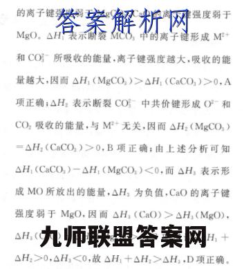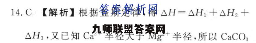 14.C【解析】根据盖斯定律,得△H=△H1+△H2十△H3,又已知Ca2+半径大于Mg2+半径,所以CaCO3的离子键强度弱于MgCO,,CO的离子键强度弱于MgO。△H1表示断裂MCO2中的离子键形成MP和CO所吸收的能量,离子键强度越大,吸收的能量越大,因而△H1(MgCO)>△H1(CaCO)>0,A项正确:△H2表示断裂CO中共价键形成OY-和CO2吸收的能量,与M+无关,因而△H2(MgCO,)=△H:(CaCO)>0,B项正确:由上述分析可知△H1(CCO)一△H1(MgCO)<0,而△H表示形成MO所放出的能量,△H,为负值,CO的离子键强度弱于MgO,因而△H,(CO)>△H(MgO),△H:(CaO)一△H(MgO)>0,C项错误:△H1十△H2>0,△H<0,故△H1十△H:>△H,,D项正确.