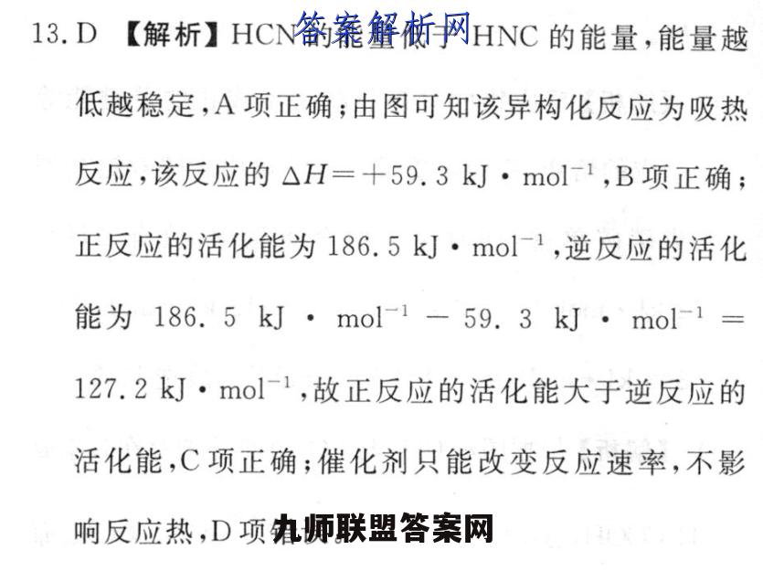 13.D【解析】HCN的能量低于HNC的能量,能量越低越稳定,A项正确;由图可知该异构化反应为吸热反应,该反应的△H=+59.3kJ·mol-1,B项正确;正反应的活化能为186.5kJ·mol-1,逆反应的活化能为186.5kJ·mo1-1-59.3kJ·mol1=127.2kJ·mo1-1,故正反应的活化能大于逆反应的活化能,C项正确;催化剂只能改变反应速率,不影响反应热,D项错误。