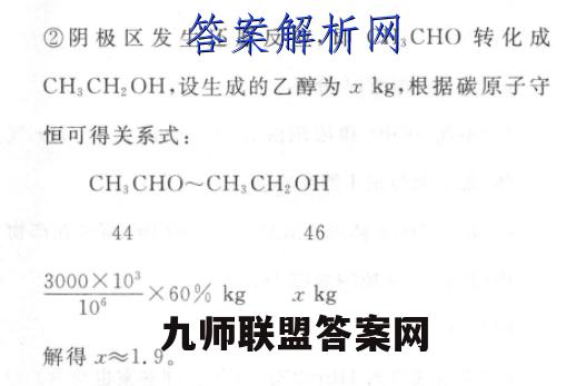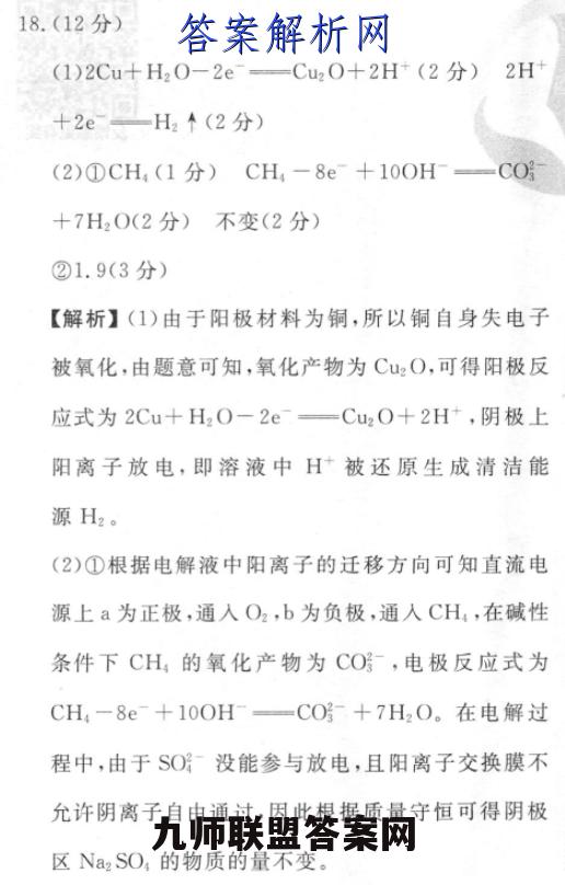 18.(12分)(1)2Cu+H2O-2e-Cu2O+2H+(2分)2H+2e—H2个(2分)(2)①CH(1分)CH-8e+10OH-=CO号十7H2O(2分)不变(2分)②1.9(3分)【解析】(1)由于阳极材料为铜,所以铜自身失电子被氧化,由题意可知,氧化产物为Cu2O,可得阳极反应式为2Cu+H2O-2e一Cu2O+2H+,阴极上阳离子放电,即溶液中H+被还原生成清洁能源H2。(2)①根据电解液中阳离子的迁移方向可知直流电源上a为正极,通人O2,b为负极,通人CH,在碱性条件下CH4的氧化产物为CO,电极反应式为CH4一8e+10OH-一CO-+7H2O。在电解过程中,由于SO没能参与放电,且阳离子交换膜不允许阴离子自由通过,因此根据质量守恒可得阴极区Na2SO4的物质的量不变。②阴极区发生还原反应,即CH,CHO转化成CH3CH2OH,设生成的乙醇为xkg,根据碳原子守恒可得关系式:CH CHO~CH CH2 OH4446300X10×60%kg109x kg解得x≈1.9。
