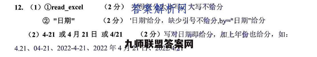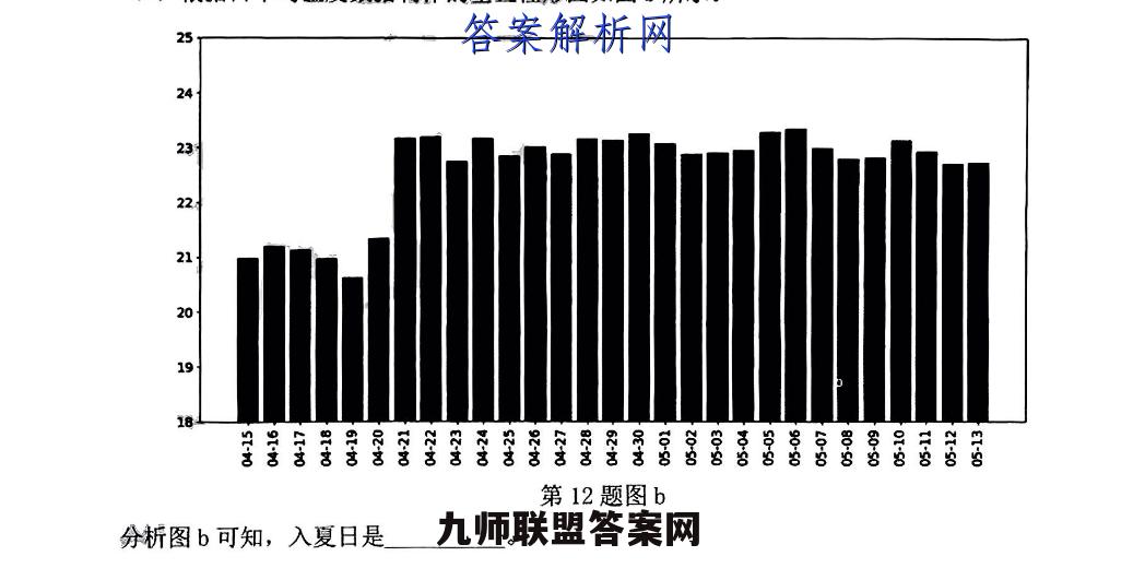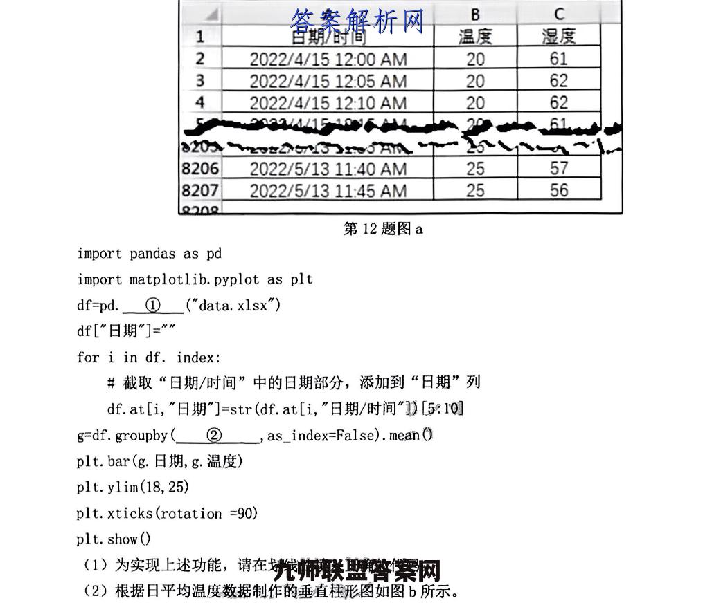 12.(1)①read excel(2分)字母区分大小写,大写不给分②"日期"(2分)'日期给分,缺少引号不给分,by="日期"给分(2)4-21或4月21日或4/21(2分)写对日期即给分,加上年份也给分,如:4.21、04-21、2022-4-21、2022年4月21日、2022/4/21ABC1日期/时间温度湿度22022/4/1512:00AM206132022/4/151205AM206242022/4/1512:10AM2062n151C42061b20e33m2y82062022/5/1311:40AM255782072022/5/1311:45AM2556。00Q第12题图aimport pandas as pdimport matplotlib.pyplot as pltdf=pd.1 ("data.xlsx")df["日期"]=""for i in df.index:#截取“日期/时间”中的日期部分,添加到“日期”列df.at[i,"日期"]=str(df.at[i,"日期/时间"])[5I0]g=df.groupby(②as_index=False).mean()plt.bar(g.日期,g.温度)plt.y1im(18,25)plt.xticks(rotation =90)plt.show ((1)为实现上述功能,请在划线处填入正确的代码。(2)根据日平均温度数据制作的垂直柱形图如图b所示。252423222120191841.0C1-4001-102-1022-4062-10器子10-50富1010070-.1060-5001.0011.5021-5081-50第12题图b分析图b可知,入夏日是