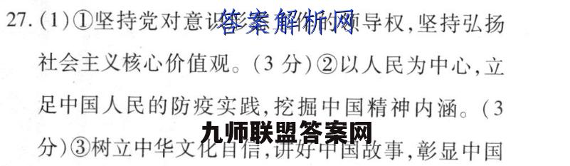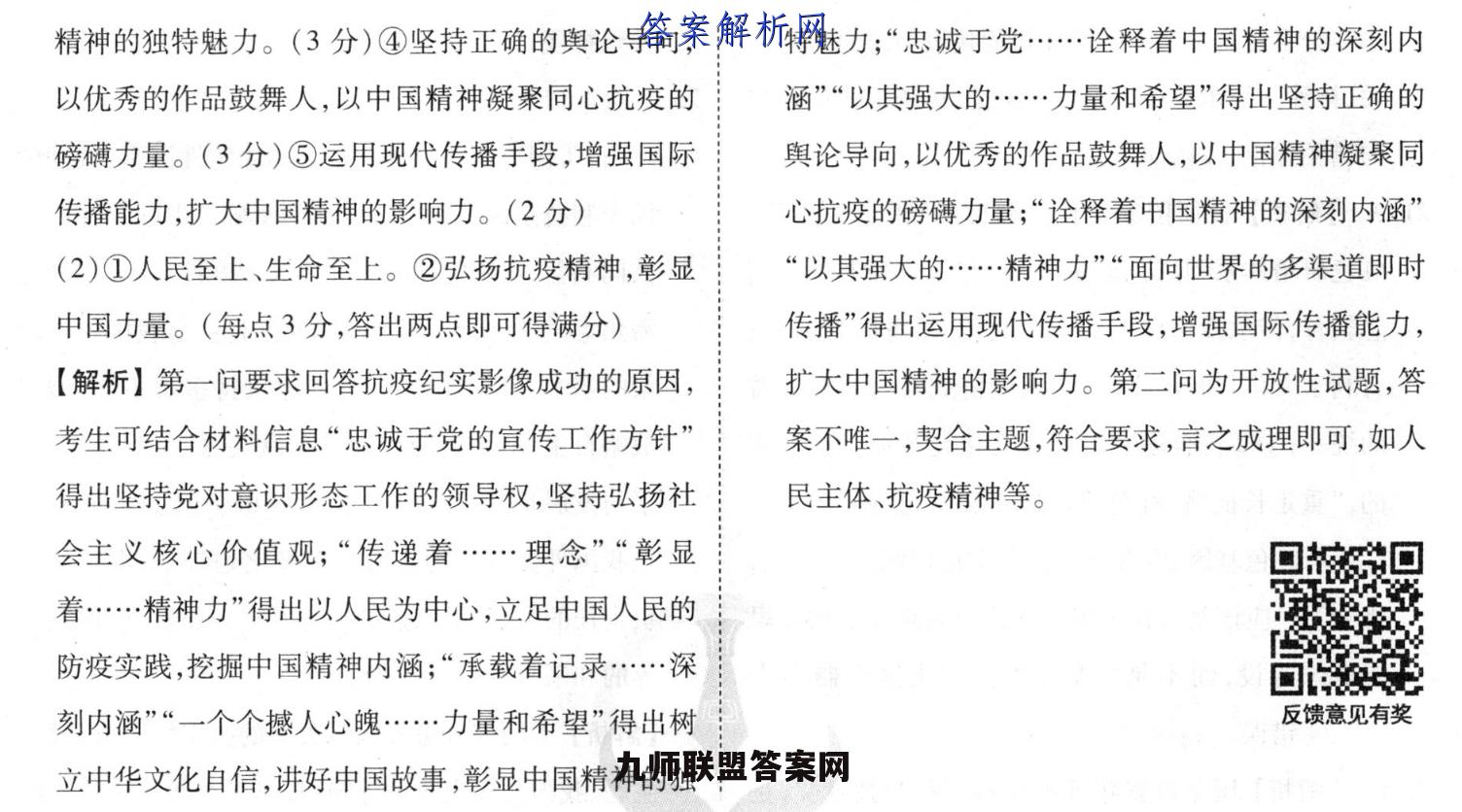 27.(1)①坚持党对意识形态工作的领导权,坚持弘扬社会主义核心价值观。(3分)②以人民为中心,立足中国人民的防疫实践,挖掘中国精神内涵。(3分)③树立中华文化自信,讲好中国故事,彰显中国精神的独特魅力。(3分)④坚持正确的舆论导向,特魅力;“忠诚于党…诠释着中国精神的深刻内以优秀的作品鼓舞人,以中国精神凝聚同心抗疫的涵”“以其强大的…力量和希望”得出坚持正确的磅礴力量。(3分)⑤运用现代传播手段,增强国际舆论导向,以优秀的作品鼓舞人,以中国精神凝聚同传播能力,扩大中国精神的影响力。(2分)心抗疫的磅礴力量;“诠释着中国精神的深刻内涵”(2)①人民至上、生命至上。②弘扬抗疫精神,彰显“以其强大的…精神力”“面向世界的多渠道即时中国力量。(每点3分,答出两点即可得满分)》传播”得出运用现代传播手段,增强国际传播能力,【解析】第一问要求回答抗疫纪实影像成功的原因,扩大中国精神的影响力。第二问为开放性试题,答考生可结合材料信息“忠诚于党的宣传工作方针”案不唯一,契合主题,符合要求,言之成理即可,如人得出坚持党对意识形态工作的领导权,坚持弘扬社民主体、抗疫精神等。会主义核心价值观;“传递着…理念”“彰显口城▣着…精神力”得出以人民为中心,立足中国人民的防疫实践,挖掘中国精神内涵;“承载着记录…深刻内涵”“一个个撼人心魄…力量和希望”得出树反馈意见有奖立中华文化自信,讲好中国故事,彰显中国精神的独