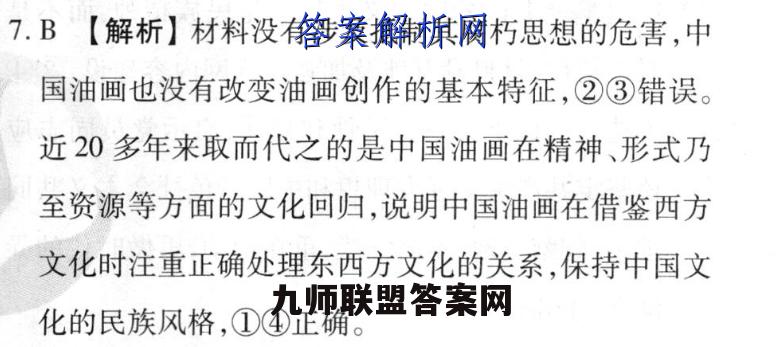 7.B【解析】材料没有涉及抵制其腐朽思想的危害,中国油画也没有改变油画创作的基本特征,②③错误。近20多年来取而代之的是中国油画在精神、形式乃至资源等方面的文化回归,说明中国油画在借鉴西方文化时注重正确处理东西方文化的关系,保持中国文化的民族风格,①④正确。