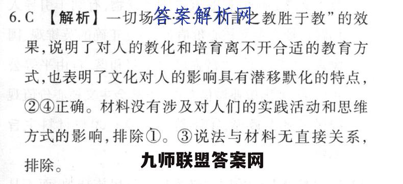 6.C【解析】一切场合…“不言之教胜于教”的效果,说明了对人的教化和培育离不开合适的教育方式,也表明了文化对人的影响具有潜移默化的特点,②④正确。材料没有涉及对人们的实践活动和思维方式的影响,排除①。③说法与材料无直接关系,排除。