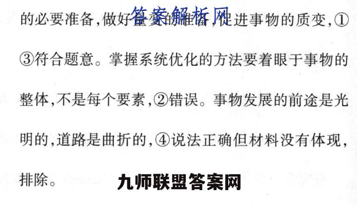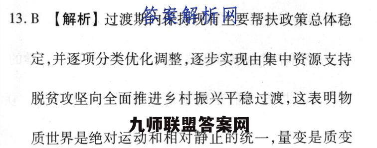 13.B【解析】过渡期内保持现有主要帮扶政策总体稳定,并逐项分类优化调整,逐步实现由集中资源支持脱贫攻坚向全面推进乡村振兴平稳过渡,这表明物质世界是绝对运动和相对静止的统一,量变是质变的必要准备,做好量变的准备,促进事物的质变,①③符合题意。掌握系统优化的方法要着眼于事物的整体,不是每个要素,②错误。事物发展的前途是光明的,道路是曲折的,④说法正确但材料没有体现,排除。