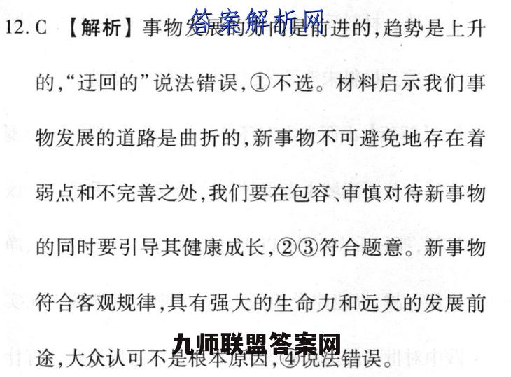 12.C·【解析】事物发展的方向是前进的,趋势是上升的,“迂回的”说法错误,①不选。材料启示我们事物发展的道路是曲折的,新事物不可避免地存在着弱点和不完善之处,我们要在包容、审慎对待新事物的同时要引导其健康成长,②③符合题意。新事物符合客观规律,具有强大的生命力和远大的发展前途,大众认可不是根本原因,④说法错误。