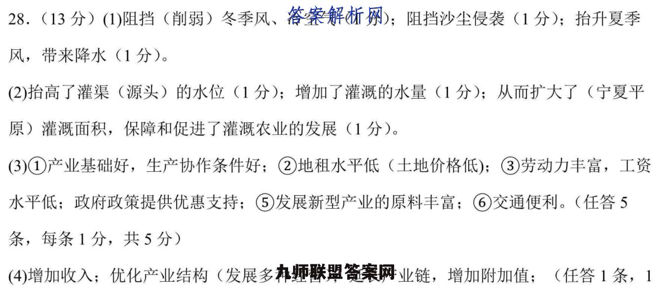28.(13分)(1)阻挡(削弱)冬季风、冷空气(1分):阻挡沙尘侵袭(1分);抬升夏季风,带来降水(1分)。(2)抬高了灌渠(源头)的水位(1分):增加了灌溉的水量(1分);从而扩大了(宁夏平原)灌溉面积,保障和促进了灌溉农业的发展(1分)。(3)①产业基础好,生产协作条件好;②地租水平低(土地价格低):③劳动力丰富,工资水平低;政府政策提供优惠支持;⑤发展新型产业的原料丰富;⑥交通便利。(任答5条,每条1分,共5分)(4)增加收入;优化产业结构(发展多种经营);延长产业链,增加附加值;(任答1条,1分)防风固沙;废物利用,减轻污染。(任答1条,1分)(有理给分)