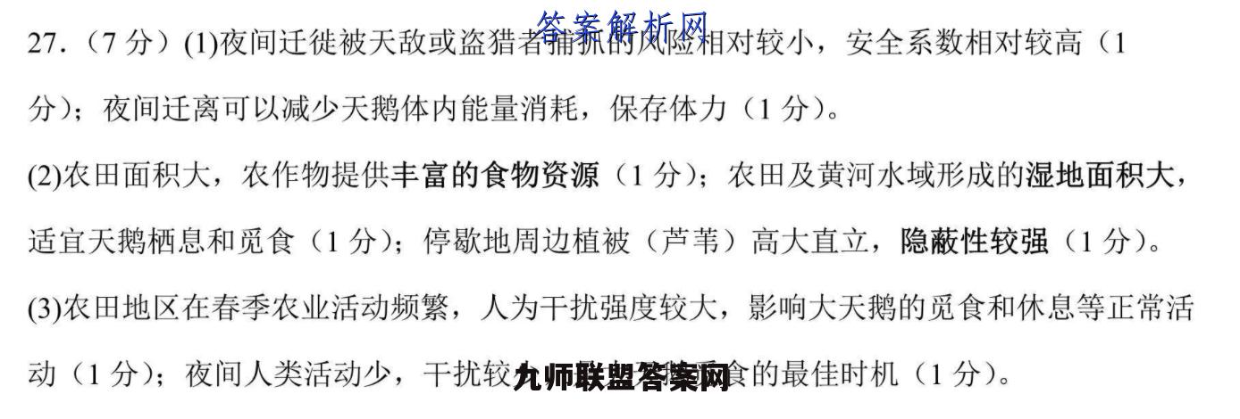 27.(7分)(1)夜间迁徙被天敌或盗猎者捕抓的风险相对较小,安全系数相对较高(1分):夜间迁离可以减少天鹅体内能量消耗,保存体力(1分)。(2)农田面积大,农作物提供丰富的食物资源(1分);农田及黄河水域形成的湿地面积大,适宜天鹅栖息和觅食(1分);停歇地周边植被(芦苇)高大直立,隐蔽性较强(1分)。(3)农田地区在春季农业活动频繁,人为干扰强度较大,影响大天鹅的觅食和休息等正常活动(1分):夜间人类活动少,干扰较少,是大天鹅觅食的最佳时机(1分)。