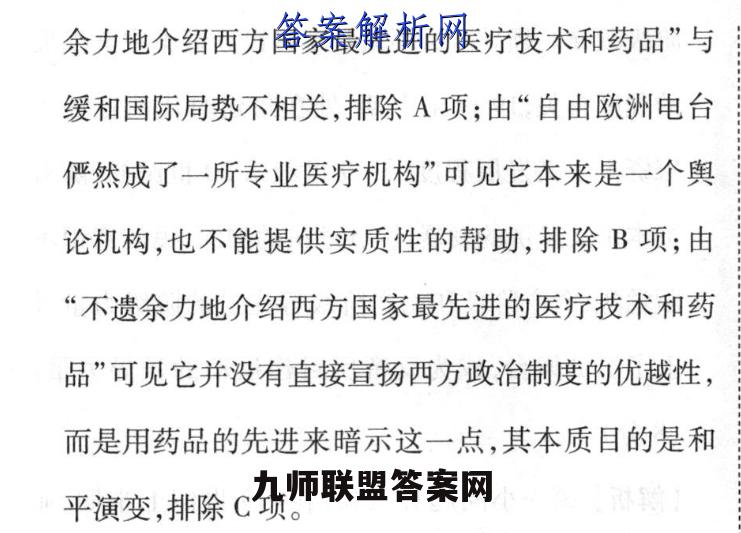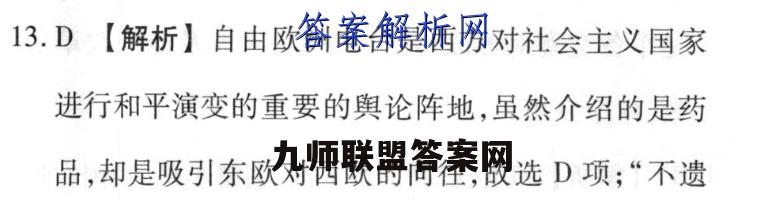 13.D【解析】自由欧洲电台是西方对社会主义国家进行和平演变的重要的奥论阵地,虽然介绍的是药品,却是吸引东欧对西欧的向往,故选D项;“不遗余力地介绍西方国家最先进的医疗技术和药品”与缓和国际局势不相关,排除A项;由“自由欧洲电台俨然成了一所专业医疗机构”可见它本来是一个舆论机构,也不能提供实质性的帮助,排除B项;由“不遗余力地介绍西方国家最先进的医疗技术和药品”可见它并没有直接宣扬西方政治制度的优越性而是用药品的先进来暗示这一点,其本质目的是和平演变,排除C项。