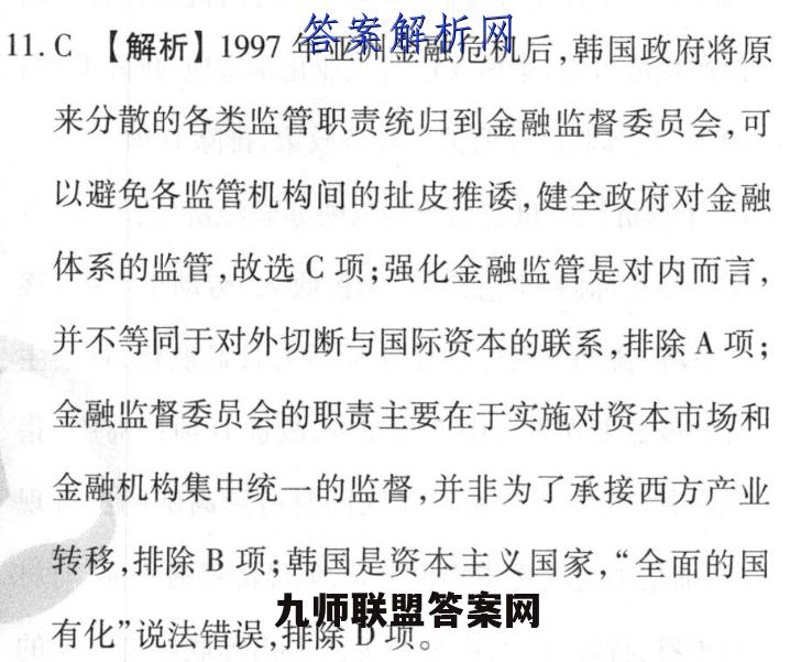11.C【解析】1997年亚洲金融危机后,韩国政府将原来分散的各类监管职责统归到金融监督委员会,可以避免各监管机构间的扯皮推诿,健全政府对金融体系的监管,故选C项;强化金融监管是对内而言,并不等同于对外切断与国际资本的联系,排除A项;金融监督委员会的职责主要在于实施对资本市场和金融机构集中统一的监督,并非为了承接西方产业转移,排除B项;韩国是资本主义国家,“全面的国有化”说法错误,排除D项。