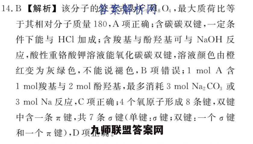 14.B【解析】该分子的分子式为CgHO4,最大质荷比等于其相对分子质量180,A项正确;含碳碳双键,一定条件下能与HCl加成;含羧基与酚羟基可与NaOH反应,酸性重铬酸钾溶液能氧化碳碳双键,溶液颜色由橙红变为灰绿色,不能说褪色,B项错误;1olA含1mol羧基与2mol酚羟基,最多消耗3 mol Na2CO3或3 mol Na反应,C项正确;4个氧原子形成8条键,双键中含一条π键,共7条6键(单键:6键;双键:一个。键和一个π键),D项正确。