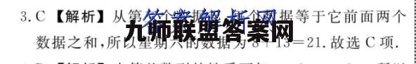 3.C【解析】从第三个数据起,每个数据等于它前面两个数据之和,所以星期六的数据为8十13=21.故选C项.