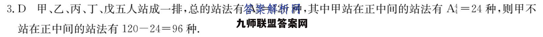 3.D甲、乙、丙、丁、戊五人站成一排,总的站法有A=120种,其中甲站在正中间的站法有A=24种,则甲不站在正中间的站法有120一24=96种.