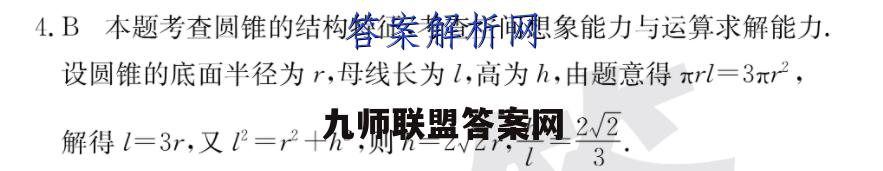 4.B本题考查圆锥的结构特征,考查空间想象能力与运算求解能力,设圆锥的底面半径为r,母线长为l,高为h,由题意得πrl=3π,h解得=3r,又P=2+h2,则h=22r,2√23
