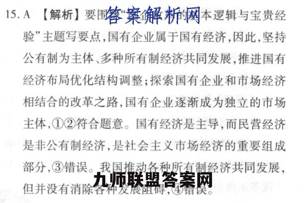 15.A【解析】要围绕“国企改革的基本逻辑与宝贵经验”主题写要点,国有企业属于国有经济,因此,坚持公有制为主体、多种所有制经济共同发展,推进国有经济布局优化结构调整:探索国有企业和市场经济相结合的改革之路,国有企业逐渐成为独立的市场主体,①②符合题意。国有经济是主导,而民营经济是非公有制经济,是社会主义市场经济的重要组成部分,③错误。我国推动各种所有制经济共同发展,但并没有消除各种发展阻碍,④错误。