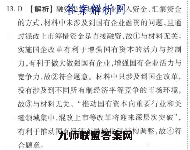 13.D【解析】融资渠道是指企业引入资金、汇集资金的方式,材料中未涉及到国有企业融资的问题,且通过混改上市筹措资金是直接融资,故①与材料无关。实施国企改革有利于增强国有资本的活力与控制力,有利于做大做强国有企业,增强国有企业活力与竞争力,故②符合题意。材料中只涉及到国企改革,没有涉及到不同所有制经济平等竞争的市场环境,故③与材料无关。“推动国有资本向重要行业和关键领域集中,混改上市等改革将迎来深层次突破”,有利于推动国有经济布局优化和结构调整,故④符合题意。