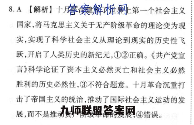 8.A【解析】十月革命建立了世界上第一个社会主义国家,将马克思主义关于无产阶级革命的理论变为现实,实现了科学社会主义从理论到现实的历史性飞跃,开启了人类历史的新纪元,①②正确。《共产党宣言》科学论证了资本主义必然灭亡和社会主义必然胜利的历史必然性,③不符合题意。十月革命沉重打击了帝国主义的统治,推动了国际社会主义运动的发展,而不是推动资产阶级革命的发展,④错误。