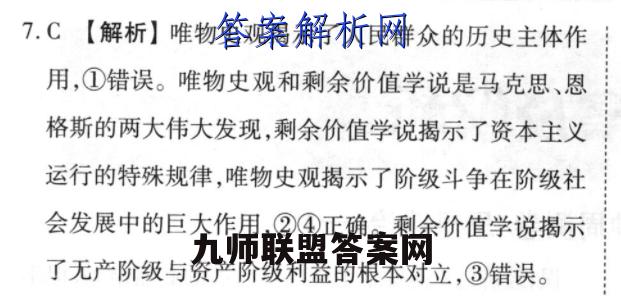 7.C【解析】唯物史观揭示了人民群众的历史主体作用,①错误。唯物史观和剩余价值学说是马克思、恩格斯的两大伟大发现,剩余价值学说揭示了资本主义运行的特殊规律,唯物史观揭示了阶级斗争在阶级社会发展中的巨大作用,②④正确。剩余价值学说揭示了无产阶级与资产阶级利益的根本对立,③错误。