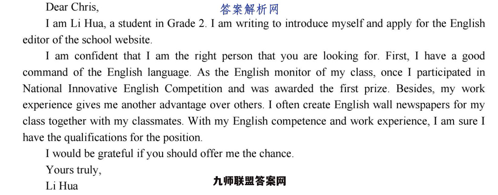 Dear Chris,I am Li Hua,a student in Grade 2.I am writing to introduce myself and apply for the Englisheditor of the school website.I am confident that I am the right person that you are looking for.First,I have a goodcommand of the English language.As the English monitor of my class,once I participated inNational Innovative English Competition and was awarded the first prize.Besides,my workexperience gives me another advantage over others.I often create English wall newspapers for myclass together with my classmates.With my English competence and work experience,I am sure Ihave the qualifications for the position.I would be grateful if you should offer me the chance.Yours truly,Li Hua