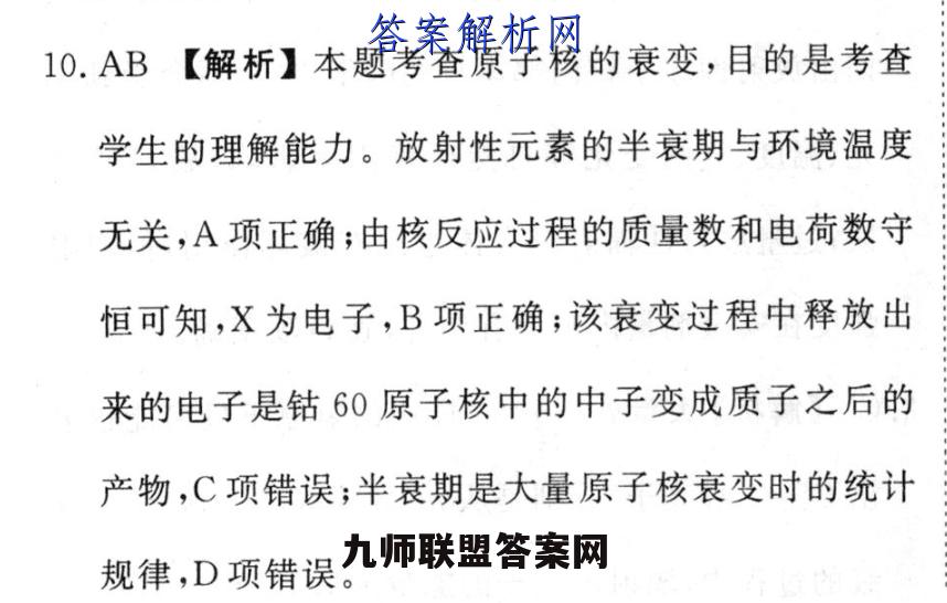 10.AB【解析】本题考查原子核的衰变,目的是考查学生的理解能力。放射性元素的半衰期与环境温度无关,A项正确;由核反应过程的质量数和电荷数守恒可知,X为电子,B项正确;该衰变过程中释放出来的电子是钴60原子核中的中子变成质子之后的产物,C项错误;半衰期是大量原子核衰变时的统计规律,D项错误。
