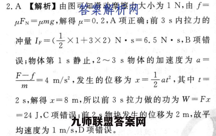 2.A【解析】由图可知滑动摩擦力大小为1N,由f=FN=umg,解得u=0.2,A项正确;前3s内拉力的冲量=(2×1+3×2)N·s=6.5N·s,B项错误;物体第1s静止,2~3s物体的加速度为a=f=4m/g,发生的位移为x=号af,其中i=m2s,解得x=8m,所以前3s拉力做的功为W=Fx=24J,C项错误;前2s物块发生的位移为2m,故平均速度为1m/s,D项错误。