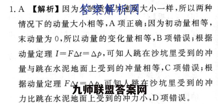 1.A【解析】因为人的质量与速度大小一样,所以两种情况下的动量大小相等,A项正确;因为初动量相等,末动量为0,所以动量的变化量相等,B项错误;根据动量定理I=F△t=△p,可知人跳在沙坑里受到的冲量与跳在水泥地面上受到的冲量相等,C项错误;根据动量定理F△t=△p,可知人跳在沙坑里受到的冲力比跳在水泥地面上受到的冲力小,D项错误。