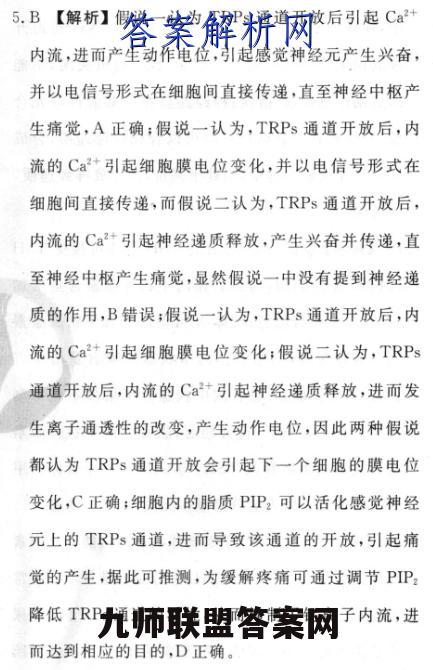 5.B【解析】假说一认为TRPs通道开放后引起Ca2+内流,进而产生动作电位,引起感觉神经元产生兴奋,并以电信号形式在细胞间直接传递,直至神经中枢产生痛觉,A正确;假说一认为,TRPs通道开放后,内流的Ca2+引起细胞膜电位变化,并以电信号形式在细胞间直接传递,而假说二认为,TRPs通道开放后,内流的Ca2+引起神经递质释放,产生兴奋并传递,直至神经中枢产生痛觉,显然假说一中没有提到神经递质的作用,B错误;假说一认为,TRPs通道开放后,内流的Ca2+引起细胞膜电位变化;假说二认为,TRPs通道开放后,内流的Ca+引起神经递质释放,进而发生离子通透性的改变,产生动作电位,因此两种假说都认为TRPs通道开放会引起下一个细胞的膜电位变化,C正确;细胞内的脂质PIP2可以活化感觉神经元上的TRPs通道,进而导致该通道的开放,引起痛觉的产生,据此可推测,为缓解疼痛可通过调节PP降低TRPs通道的活性,从而抑制了钙离子内流,进而达到相应的目的,D正确。